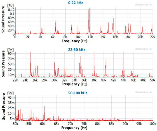 The LDV was not able to measure the disc vibration above 22 kHz since it was out of its measuring range. This is why an ultrasound sensor was also used in this experiment. Zhu et al. [48] demonstrated that there is a direct relationship of the vibration of the structure and the acoustic pressure measured by a microphone, or, in this case, an ultrasound sensor. Measuring the high frequency ranges of excitation with the ultrasound sensor gave an idea of the vibration of the disc at those frequencies.