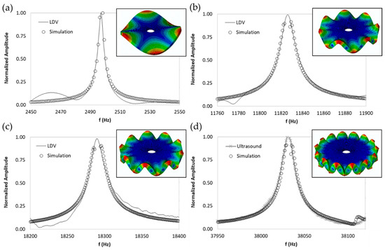 The numerical harmonic analysis was performed around the natural frequencies found by means of the modal analysis. The damping ratio obtained with the experiments (see Table 1) was introduced in the numerical model for each mode-shape. Figure 11 shows an example of the results obtained for four different natural frequencies. In the plots (a), (b), and (c), the numerical results are compared with the experimental results obtained with the LDV. In plot (d), the numerical results are compared with the ultrasound sensor since the LDV could not measure at this frequency. The FRF was normalized with the maximum of each peak and the frequency of the simulation was corrected with the error factor shown in Table 2. A good agreement for the amplitude was found between the numerical and the experimental results at the natural frequency, which is the point where the disc will be excited to expose cells to vibration. Therefore, the numerical model was validated and will be useful for further design steps, as well as for the prediction of the vibration amplitude at the natural frequencies on the whole disc surface.