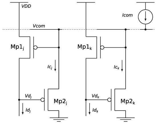 The basic (analog) WTA circuit, as firstly proposed by Lazzaro [5] is depicted in Figure 1 for a two-cell (j and k) pMOS (saturated) configuration. In a real scenario, Idj and Idk should be the input signals codifying the particular magnitude to be processed. A quiescent state in which Idj = Idk is initially assumed. Ideally being that Mp1j = Mp1k and Mp2j = Mp2k, Icj = Ick = Icom/2 is induced. As a consequence, Vdj = Vdk. If, eventually, Idj current increases by a small amount of δI, Mp1j sinks this extra current by increasing its VDS voltage, and then it decreases drain voltage Vdj due to the Early effect. Subsequently, VGS in Mp2j increases, promoting the rise of Icj. Because Icom is necessarily equal to Icj + Ick, the increase of Icj produces a reduction of Ick, which forces a decrease of Vdk, again due to the Early effect, while keeping Idk constant. This process has a positive feedback, so that at the end Icj is close to Icom, Idk close to zero, Vdj the lowest allowed by the surrounding device, and Vdk close to VDD.