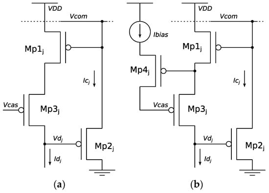 As a trade-off between resolution, stability, and speed, it has been considered an improved-gain input stage, as is depicted in Figure 2a. It is based on the addition of a cascoded transistor (Mp3) between Mp1 and Mp2, as proposed in Reference [17]. This way, output resolution is increased in about the order of the output impedance increase introduced by Mp3, which is about one order of magnitude. When considering higher gain stages, such as that proposed in Reference [7] and depicted in Figure 2b, unacceptable oscillations appear. As is demonstrated later, with the proposed circuit, the obtained resolution is appropriated for avoiding instabilities, but is not high enough for avoiding multiwinner situations. This multiwinner issue is solved in Section 3.3.