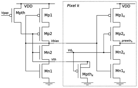 Figure 3 shows the proposed adjustable-threshold circuit based on the voltage comparator described in Reference [7]. The inverter, formed by Mp1, Mp2, Mn2 and Mn1, generates the common Vbias to the comparators of all the pixels in the array. The figure also shows the comparator of one of the pixels (k); its output prewink indicates whether it is a potential winner (prewink = 1) or not. The comparator of each pixel (slave) is identical to the bias generator (master); thus, for the same Vbias, they have the same comparing threshold Vth. To ensure that at least one winner is selected, a value of Vth was chosen that is always above the minimum Vdk in the array. This is done by means of transistors Mpth and Mpthk as follows: let us suppose pixel k is a clear winner with the lowest Vdk. In this case, any Mpthj (j = k) is cut off and the drain current of Mpthk is the same of Mpth; thus, the Vgs of both transistors are the same. Vgs of Mpth is adjustable value Vgap, and Vgs of Mpthk is Vdk – Vth. Therefore, Vth = Vdk + Vgap, that is to say, comparing threshold voltage Vth is always above the voltage of winner Vdk by an adjustable amount of Vgap. In the case of several winners, the current of Mpth is shared among the winners and Vdk < Vth < Vdk + Vgap. This is a good behavior because it is better to approximate the comparing threshold to the voltage of the potential winners to reduce the number of selected winners when there are many. Vgap is an input of the sensor that is set externally and serves to control the number of potential winners.