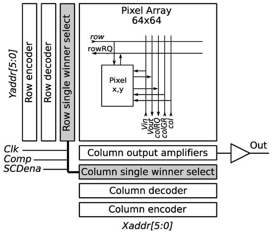 Figure 4 shows the blocks of the SCD sensor. The blocks’ Column single-winner select and Row single-winner select form the digital single-winner selection circuit. Inside of the pixel array of this figure, a single pixel is represented with its column and row signals. Any potential winner of the array (there can be many as selected by the analog WTA) sets its Column Request (colRQ) signal. The 64 colRQ signals enter the Column single-winner select circuit, which is an inhibitory pipeline as stated before, with the difference that it only has 64 elements instead of all the pixels. This circuit selects just one column asserting the Column Granted (colGR) signal back to the pixel in the array. All the winner pixels in that column then assert the rowRQ signal to the Row single-winner select circuit that selects just one of them. At that moment, the decision for the winner pixel is taken, but it is not read out until it is externally indicated by the Clk signal. When the Clk is high, the row and column of the winner pixel are latched to the corresponding row and col signals. In this way, the pixel with row and col activated knows that it is the winner. Then, it opens its output buffer, resetting the internal capacitor that stores the last read-out value. Since the current and last illumination levels are now equal, its difference is zero, and this pixel immediately loses the competition, initiating new winner selection. The winner pixel remains selected by col and row until the Clk signal is again set, and a new pixel is selected. The 64-bit row and col signals are encoded to generate the 6-bit Y and X addresses, respectively, of the winner pixel. An external processor can take the address and the illumination level of the winner pixel to process them. This is a normal SCD operation, where pixels are read out ordered by their illumination-level change. However, this sensor is also prepared to work as a frame-based standard CMOS vision sensor. In that case, the address is provided by an external processor to the sensor in order to select the desired pixel. The internal Row and Column decoders translate the address to a specific row and column that select the pixel to read out. The operation mode is selected with the SCDena signal (SCD enable).