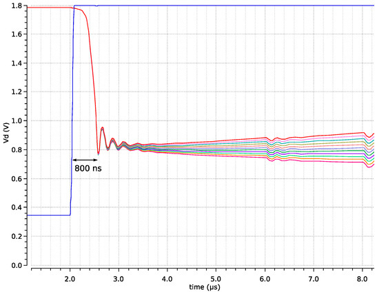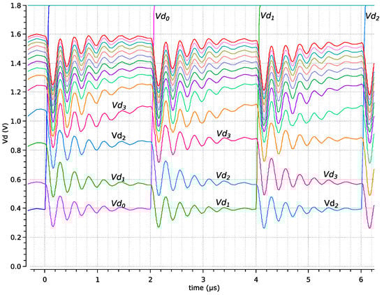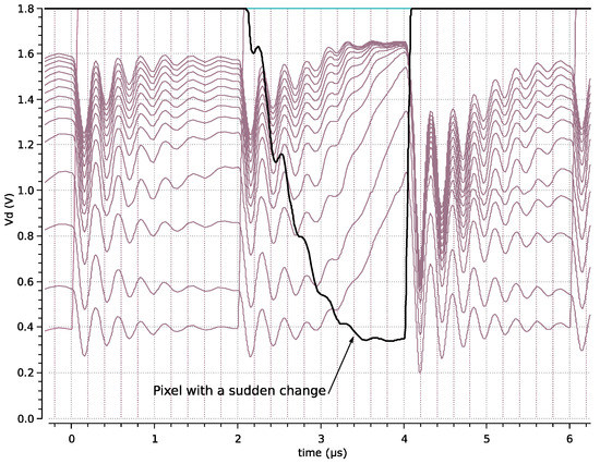 A simulation was performed supposing a camera moving in an artificially illuminated environment. In this situation, many pixels change at the same time. The pixels that have changed the most have a similar change, although slightly different. Figure 5 shows a simulation with the 4K (64 × 64) pixel array of the implemented SCD sensor. The Vdi voltage of the 14 pixels with the largest change is shown in the figure. Every 2 µs, a pixel is readout, and its Id current, which is proportional to the illumination change, becomes zero. The Vd of the selected pixel almost instantly rises to VDD (+1.8 V), and a new pixel can be selected to be the next winner. This process is shown in the figure: at the beginning (time = 0) Pixel 0 is the pixel with the lowest Vd; thus, at time = 2 µs, it is selected as the winner, its Id0 is reset, and Vd0 rises to VDD in about 70 ns. At this time, all other Vdi readjust themselves, and Pixel 2 becomes the pixel with the lowest Vd. This process is continuously repeated at the rate fixed by external clock Clk. There is a small attenuated oscillation of the Vd signal that depends on transistor dimensions and the WTA number of inputs (the largest, the worst). The winner-comparison threshold is chosen to be above the amplitude of the oscillation to avoid the lack of winner selection.