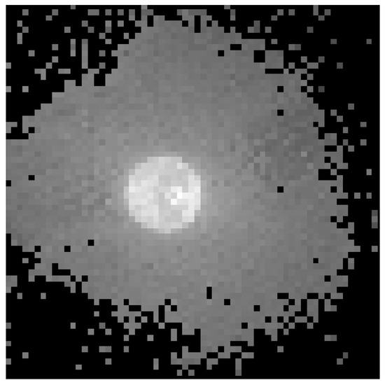 Figure 9 shows the “image” obtained from the pixels read in SCD mode. It is possible to see that few pixels correspond to the LED, while most of them correspond to the periphery. Comparing this image with Figure 8, it is easy to map the few pixels of the LED with the first pixels read after the event (from 0.560 to 0.750 ms in the figure). The rest of the pixels, meanwhile, belong to the LED “corona”, or periphery, formed by light dispersion around the LED. These periphery pixels are far more numerous, and they present similar illumination differences, though they can still be separated by the WTA circuit, as shown in Figure 8 from 1 ms to the end. There is a clear decreasing tendency in the curve despite the small illumination differences. These smaller illumination differences also produce higher dispersion and noise.