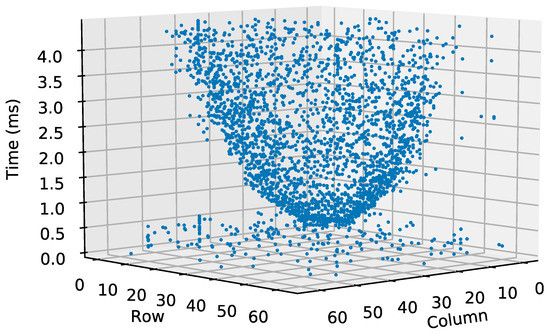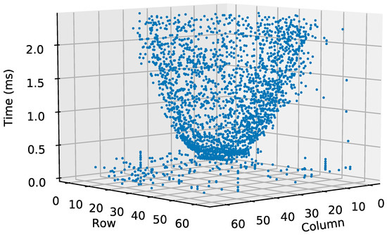 Figure 10 represents the pixel co-ordinates (row and column floor axes) over time (vertical axis). The figure shows an inverted cone, with its vertex at the precise moment the LED switches on. The cone vertex is wide because it includes most of the LED pixels that are quickly read out after the event happens. The rest of the cone corresponds to the LED corona pixels. This cone is formed because LED corona illumination slowly decreases from the LED center to the periphery. The WTA has enough resolution to still form a cone despite the small change in illumination in the corona.
