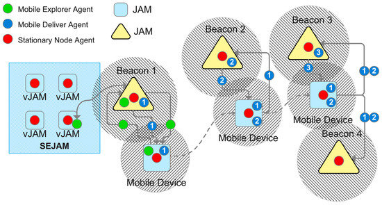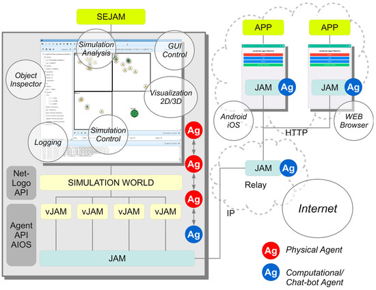 Simulation is performed by the Simulation Environment for JAM (SEJAM, details are discussed in [31,33]). In this work, the SEJAM simulator is used to create a simulation world (consisting of entities represented by agents) that is attached to the Internet enabling remote crowd sensing with mobile computational agents. The SEJAM simulator is basically a graphical user interface (GUI) on the top of JAM, shown in Figure 2.
