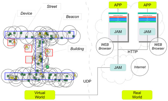 The principle concept of closed-loop simulation for augmented virtuality: (Left) Simulation framework based on the JavaScript agent machine (JAM) platform (Right) Mobile and non-mobile devices executing the JAM platform connected with the virtual simulation world (via the Internet) [24].