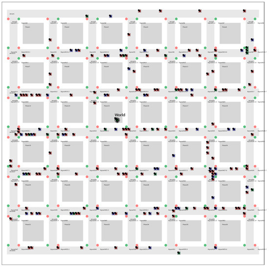 Finally, the traffic control algorithm was evaluated in Figure 16. Again, the traffic flow of 200 vehicles with zig-zag routing was evaluated (δ = 1.0, σ = 0). Two traffic signal control algorithms were compared: On the left side the static global switching algorithm (with t1/t0 = 500/60), and on the right side a dynamic local switching algorithm with dynamic switching times based on vehicle flow densities before each signal of a crossing. The global mode switches all signals of crossings globally and periodically, the local mode switches signals of each crossing individually. The dynamic flow-based switching increases arrival times by 2 times, and the velocity of vehicles shows low modulations and is near by the default velocity v = 50 (arb. units).