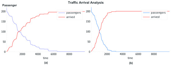 In Figure 14, a closed simulation with vehicles (individual class) and different traffic signal switching times were investigated. The simulation started with an initial population of 200 vehicles at random starting positions. The plots show the time-resolved decrease of driving passengers and increase of arriving passengers (in this case vehicles with on driver as a passenger) due to arrival at a destination position. The first plot (a) uses a signal switch time (red ↔ green signal state) of 500, the second plot of 200 simulation time units. Either North-South (NS) streets get green lights, or the West-East (WE) streets. The switching time has a significant impact on the mean arrival time of vehicles, although vehicles uses NS and WE streets, but the arrival time do not depend on individual parameters, i.e., security distance and routing strategy (zig-zag versa straight-line). The vehicle flow depends on the routing behaviour (straight-line shows lower dependence on signal switching times).