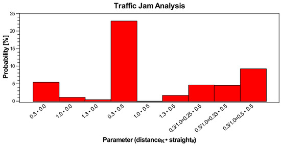 In Figure 15, the simulation was extended with MCWS and digital twins posing individual behaviour. The MCWS users were chosen randomly. The goal of this simulation was to identify jams and the dependence on driver behaviour parameter. Two main parameters were identified: The security distance and routing (straight-line vs. zig-zag shortest path) behaviour. Again, about 200 vehicles were created, a fraction with a default behaviour, and another fraction with individual behaviour. The value of the security distance parameter δ has significant impact on the jam probability (defined by the number vehicles involved in jams relative to the overall number of vehicles). A value δ = 1.0 relates to a law-conforming driving style, a lower value means a riskier driving style with lower distances to other vehicles, and a higher number a more defence driving style. Lower security distances (relative to current vehicle velocity) increases the jam probability due to a modified vehicle flow (accidents are not considered here). The is more important if a straight-line routing style (parameter greater than zero) is chosen by the driver. The last three bars in the plot show a distribution of the security-distance parameter (25%, 33%, 50%). Even a low fraction of 25% risky drivers increases the jam probability significantly.