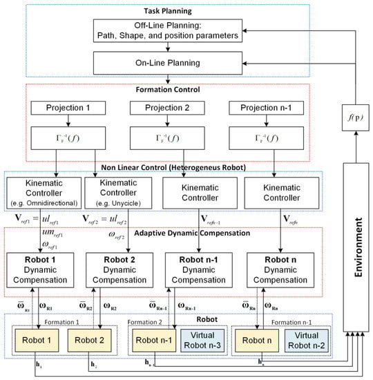 The multilayer scheme defines how the appropriate variables that make up the cooperative control of heterogeneous mobile robots are distributed (Figure 1). Taking into account that each of the layers has different functionalities, the scheme is divided into six sections: (1) Acquisition of the characteristics of the environment allows planning the path to follow, maintaining the integrity of the robotic systems as well as fulfilling the pre-programmed task. This section has two layers, and in the off-line planning layer, the initial parameters are configured, i.e., the desired path to be followed, the starting locations of all the robotic systems, and the desired structure of formation. The on-line planning layer allows the execution of the secondary objectives, reacting to the unforeseen environmental changes in the off-line layer, produced by the lack of space to fulfill the desired parameters of formation, objects to avoid along the path, environmental conditions that require to change the formation performed, among other conditions, that can alter the fulfillment of the task. This is also very important because, through this scheme, you can navigate between the structured and unstructured environments. When the path is known, or the operating environment has already been obtained previously, this information is entered in this layer, if not, and as the robots are multi-sensors, you can easily install a radar and make the path planning and follow those trajectories found in real-time.