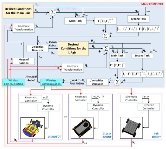 In related research, the concept of cooperation is generally interpreted in two different ways: Based on leader-follower and based on a virtual leader [12,13,14]. In the leader-follower consideration, one of the robotic mechanisms plays the role of leader complying with the tracking of the established path, while the other ones move relatively to the main robot. This configuration, although it is simple to implement, does not supply robustness when secondary objectives are required and depend directly on the execution of a single robot. In contrast, the virtual leader consideration generates a virtual formation that serves as a pattern for the rest of the vehicles to maintain a desired position and orientation. From a comparative perspective, the first consideration is led to applications where environmental disturbances are minimal, and computational processing is low [15]. On the other hand, the virtual leader approach allows executing secondary tasks such as obstacles avoidance, reshaping, minimizing of movements, and so on, since there is not a single robot in charge of achieving a control objective, but the formation follows a virtual leader, which can be modified due to disturbances in the environment. However, it requires a relatively high computational cost, as well as a resilient and robust communication structure. A cooperative robotics structure must additionally consider the distribution of control, which maintains the robotic set [16]. In the centralized control, one vehicle generates the calculation of all the velocities which the fellow robots must have as a reference to maintain the formation, where that robot has relatively high processing characteristics. On the contrary, the decentralized control considers that the formation characteristics are shared among the participants at a very high level, where the control actions to maintain the desired grouping are calculated for each vehicle individually. Although both configurations require some type of intercommunication to ensure satisfactory execution, the second case requires high reliability of data exchange to achieve the control objectives [17]. A considerable advantage of decentralized control is the integration of different control methods to the group of robots, taking into account that generally for cooperative robotics, the most important aspect is to maintain the position of the robotic set into a trajectory or path.