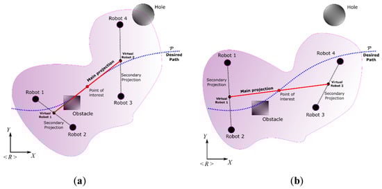 Considering the proposed splitting in Equation (21), differentiated controls can be proposed to achieve both the primary and secondary objectives. The work proposes as the main objective of the point of interest (redefined as for the application of the proposed controller) follows a profile not parameterized in time, with a velocity imposed by the designer. On the other hand, the secondary objective was to modify the formation of robotic systems, as long as they did not conflict with satisfying the first objective. Having a formation based on projections, the main projection plays an important role since it is the basis for calculating the velocities that the rest of the projections will adopt to fulfill the tasks. Additionally, having a main straight line that can be projected and oriented according to the requirements of the controller designer allows locating the robotic systems to be agreed upon. Contrast the possibilities (a) and (b) of Figure 4; the first projection has a different length and orientation to the second projection. However, the main objective was achieved in both, where the variation in distances and secondary orientations did not conflict with the main task. The following paragraphs describe the characteristics mentioned in more detail.