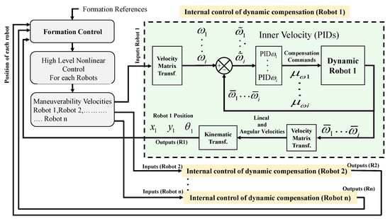 The cooperative control of heterogeneous mobiles considers that the type of robots incorporated into the formation system includes its own kinematic controller and a dynamic compensator, therefore, for the formation control, the type of system included is transparent. This section briefly describes the basic control scheme to maintain the formation of many robotic systems, a basis to integrate more robots in a scalable way. Figure 3 shows the control structure implemented for this work, denoting both the controllers which maintain the formation, orientation, and following of the desired path and the controllers that correct the final actions of each robot.