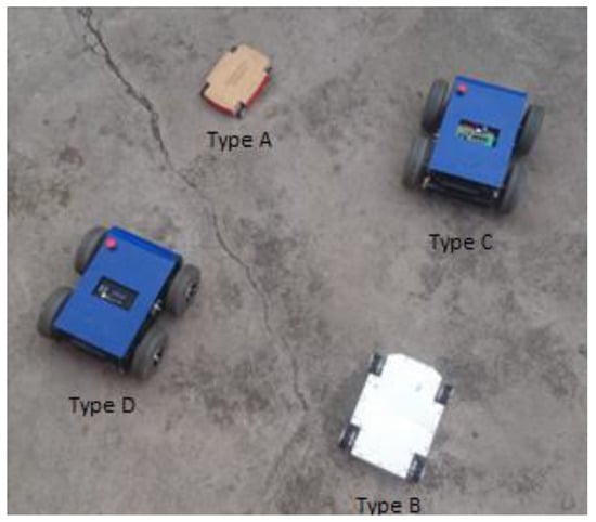 Experimental results are shown in this Section. To demonstrate the scalability of the proposed system, the fulfillment of tasks with two, three, and four robots were proposed. In order to include more robots, it was necessary to add the recognition of communication frames and a control segment for the new projection. At the computational level, this did not significantly increase the processing time since dynamic and kinematic controllers were carried out in each robot. An additional simulated result was included at the end, in order to validate the scalability of the control system. The control scheme presented in Figure 3 allows meeting the objectives of shape and position for a system of multiple heterogeneous robots. For the validation of the proposed controller, robots of different dynamic configurations were used in order to experience the scalability of the cooperative control. Figure 8 shows the robots used for the experiments performed. It can be seen that the set of robots was heterogeneous, with two holonomic omnidirectional robots of different characteristics: Type A was an omnidirectional robot, while the Type B robot was very similar but contained components of greater performance that made it able to carry heavy weights; the Type C robot was a normal unicycle robot, with two rear-wheel drive, and finally the Type D robot had a four-wheel drive.