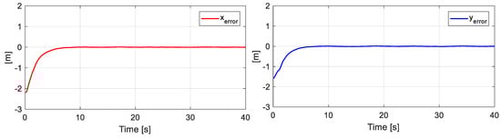 Additionally, considering Equation (21) to be perfect tracking, there is . Performing a similar procedure of analysis that Equations (27) in (39), it is concluded in the same way that , therefore the values of the diagonal matrix must be considered as , hence the control error come close to being zero when , then the system is asymptotically stable.