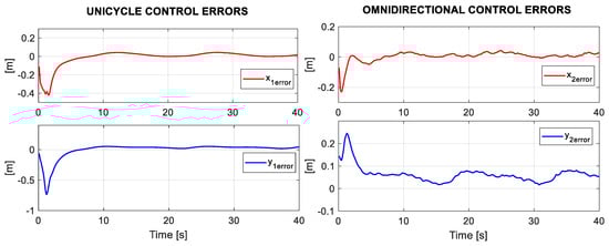 Figure 10 presents the desired position errors of the object. It is noted that at the beginning of the experiment, there was a major error that was caused by the initial positions of each robot. Once the point closest to the path was found, the mobile platforms were positioned in such a way that the position of the main objective was on the desired path.