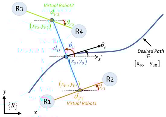 Since the formations are composed of projections between a pair of robots, an additional formation is necessary to include a third robot, requiring the use of a virtual robot to generate the additional projection. It is assumed that the object to be transported or the shape that the robotic set should have does not have a defined geometry—it may have an unequal weight distribution, or it could be moving in a semi-structured space. In this aspect, the fulfillment of tasks with this type of objective can present better results if the robotic mechanisms have heterogeneous characteristics such as car-like, omnidirectional, or differential robots. The location of each of the robots depends totally on the requirements of the tasks, being able to alter the configurations at any moment of time if the workspace requires it.
