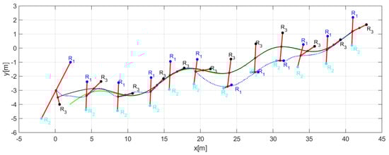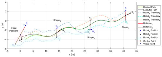 Through the changing of shape, it was verified that during the execution of the task, the robots could autonomously modify the positions to move the object from one place to another following a defined path. Figure 14 shows the stroboscopic movement of the executed task, while in Figure 15, it is appreciated how the shape of the robotic set changes gradually.