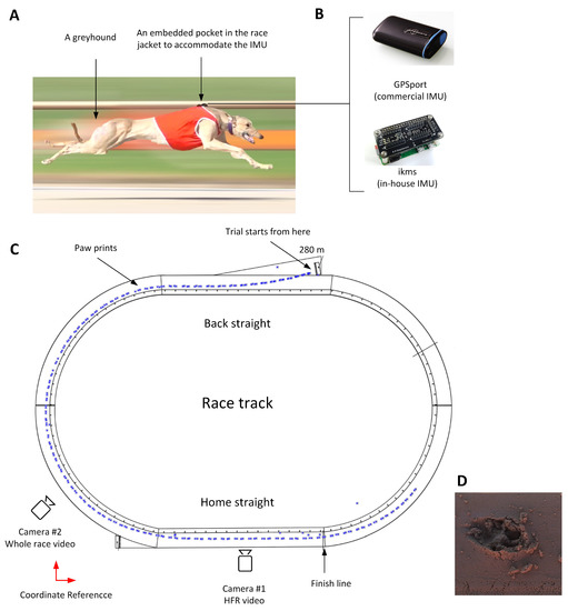 A greyhound galloping on the straight section of a track with sand surface and wearing the modified jacket with Inertial Measurement Unit (IMU) pocket (A). The commercial (GPSports/SPI Pro X) and in-house IMU (shown here without its protective cover) (B). The schematic view of the oval-shaped sand track and the greyhound’s paw prints marked in blue. The coordinate reference depicts the location of the theodolite that was used to survey the paw prints. Two cameras are mounted for simultaneous kinematic video capture (C). Greyhound’s paw print (D).