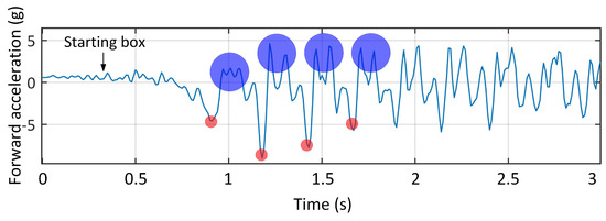 Anterior-posterior acceleration vs. time of eight consecutive strides of a greyhound. The negative peaks (highlighted by red marks) correspond to fore-leg strikes and the positive peaks (highlighted with blue marks) correspond to hind-leg strikes.