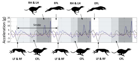 Using the HFR data, the footfall timing of each of the limbs during the rotary gallop was measured. Rotary gallop is a four-beat gait with two flight phases [37]. The pattern of limb impacts in this gait is rotating that is, left fore-leg (LF), right fore-leg (RF), compressed flight phase (CFL), right hind-leg (RH), left hind-leg (LH) and extended flight phase (EFL). The footfall timing was used to match the acceleration signals with the relevant “gait events” of the rotary gallop. The time difference between two consecutive negative peaks was one stride (approximately 300 ms). As mentioned, the negative peaks were due to fore-leg strikes. Adding the LF and RF stance duration leads to the fore-leg lift-off or beginning of the CFL. The next event is the hind-leg strike. Adding the RH and LH stance duration leads to the hind-leg lift-off or the beginning of the EFL. Finally there is another negative peak in forward acceleration which is the beginning of the next stride. We continued to use this method for the remaining signals and obtained the same pattern as evidenced in Figure 3.