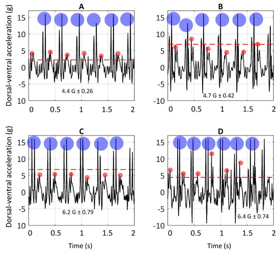 Dorsal-ventral acceleration of six consecutive strides on Home straight of Track A (A). Dorsal-ventral acceleration of six consecutive strides on the bend of Track A (B). Dorsal-ventral acceleration of six consecutive strides on Home straight of Track C (C). Dorsal-ventral acceleration of six consecutive strides on the bend of Track C (D). The blue and red circles show the hind-legs and fore-legs strikes, respectively. The red dashed lines show the average of peaks of signals due to fore-leg strikes.