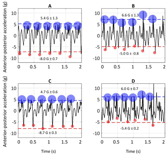 The anterior-posterior accelerations versus time of greyhounds galloping on Track A are plotted in Figure 5A,B. The negative peaks in anterior-posterior acceleration are associated with the fore-leg strikes and the positive peaks are due to hind-legs strikes, as mentioned earlier. Comparing the signals resulting from the fore-leg strikes on the bend with those of the Home straight showed a significant difference [t(4) = −8.47 p = 0.002].