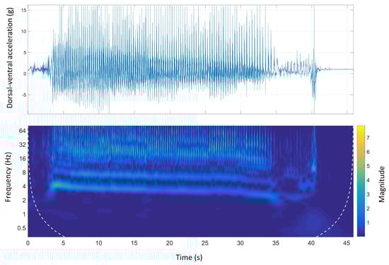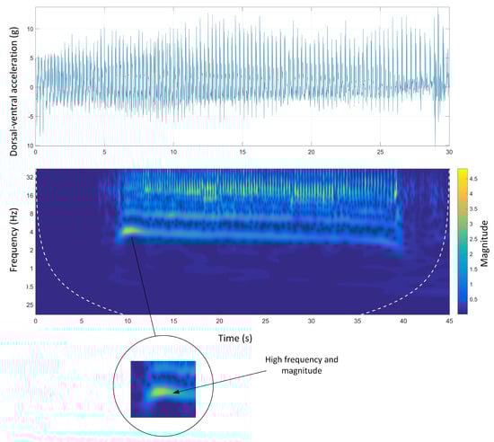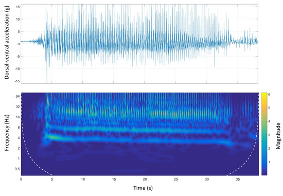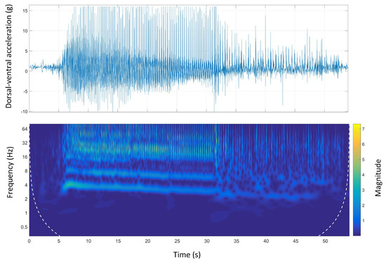 Figure 11 shows the time-domain and Morlet wavelet power spectrum plots for the dorsal-ventral accelerations of Track C. Similar to Track A and B, the magnitude and frequency of the signals were decreasing. Also, the animal walking in the catching pen area before stopping was clear in the wavelet spectrum as the frequency and power of the signals decreased.