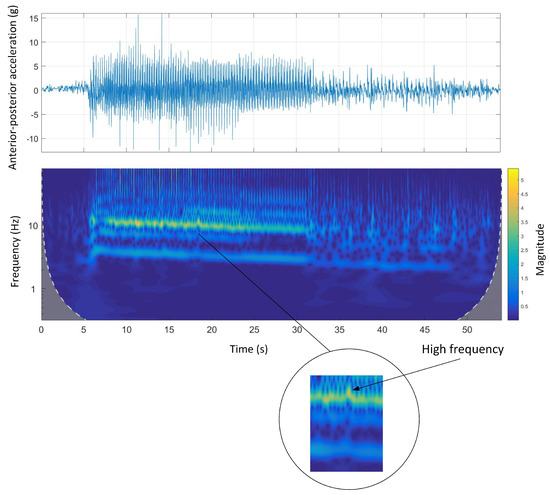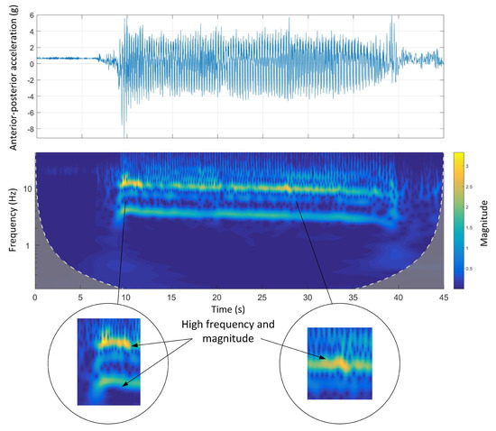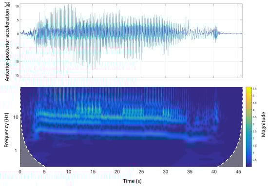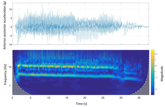 Figure 9 shows the time-domain and Morlet wavelet power spectrum plots for the dorsal-ventral accelerations of Track B. The stride and the step frequency of the acceleration phase was 4 Hz and 8 Hz, respectively. Similar to Track A, the stride and step frequency decreased during the course. The sharp spike in the time-domain signal was due to catching the mechanical lure in the catching pen which is also clear in the wavelet plot.