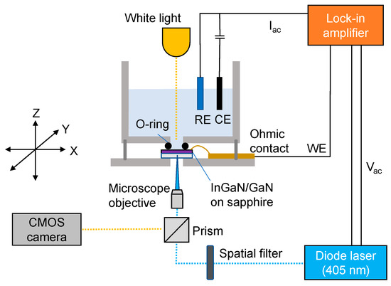 In this work, InGaN/GaN on sapphire was investigated as a new substrate for AC photoelectrochemical imaging, aiming to solve the above-mentioned problems. InGaN is a semiconductor alloy with a direct band gap that can be tuned from the near-infrared (0.6 eV, InN) to the ultraviolet (3.4 eV, GaN) by adjusting the indium concentration. It has been used widely in developing LEDs [26,27] and photovoltaic devices [28] owing to its strong light emission and absorption and a wide range of band gaps. InGaN has also gained significant attention in photoelectrochemistry. With band edges straddling oxygen and hydrogen redox overpotentials, p-type GaN/InGaN nanowires have been investigated in water splitting [29], having the advantages of high carrier mobility, good chemical stability and band gap tunability. GaN/InGaN nanowires have also been shown to exhibit excellent optochemical and electrochemical sensor performance, achieving the detection of pH [30], oxidizing gases (O2, NO2 and O3) [31] through photoluminescence, and electrochemical detection of nicotinamide adenine dinucleotide (NADH) [32]. In this work, it will be shown that epitaxial layers of InGaN are suitable for photoelectrochemical imaging with good lateral resolution and have great potential in bioimaging applications.
