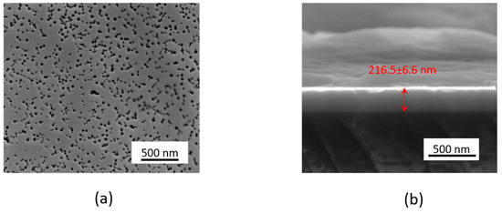 The SEM analysis of the InGaN/GaN structure is presented in Figure 2. The SEM top view in Figure 2a shows the InGaN surface with a high density of pits ((2.26 ± 0.08) × 1010 pits/cm2) ranging between 20 nm and 50 nm in diameter, as some of the pits have merged. These “V-pits” are well known in InGaN growth and consist of an inverted hexagonal pyramid emanating from a threading dislocation formed at the sapphire/GaN interface. The pits open up during InGaN growth, which takes place at relatively low temperatures [33]. The total thickness of the InGaN/GaN epilayer was about 216.5 ± 6.6 nm, as shown in Figure 2b. Four-probe electrical measurements using soldered indium contacts showed a resistivity of 0.02 Ω·cm due to the n-type conductivity of the epilayers. A photoluminescence (PL) spectral map (Accent RPM2000, exc = 266 nm) of the 2-inch wafer showed a strong emission band centered at 448 ± 2 nm indicating an average indium fraction of ca. 17.5% [34].