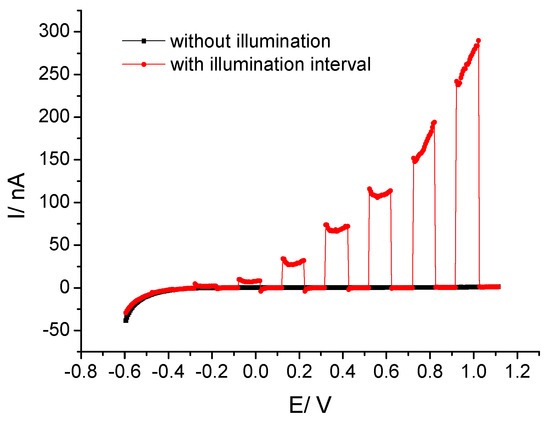 Figure 5b shows the characteristic AC photocurrent−voltage (I−V) curve of InGaN/GaN in the voltage range -0.6 V to 1.0 V in pH 7.4 DPBS under the illumination of a focused laser beam (modulation frequency was 1 kHz). It shows that the photocurrent increased with the applied bias, to a value of 12 nA at 1.0 V. Even at 0 V, a photocurrent of 8.5 nA was observed. The low onset potential of InGaN/GaN is in accordance with its low flat band potential [40,41], indicating that the electrode can become depleted by applying a low bias, facilitating the separation of photo-induced charge carriers. Therefore, it provides the possibility for measurements at zero applied bias.