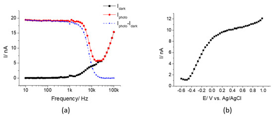 (a) Frequency dependence of the AC photocurrent and the background dark current measured at 1.0 V; (b) Characteristic I−V curve of InGaN/GaN measured in pH 7.4 DPBS at 1 kHz with a focused laser beam at 18% maximum intensity.