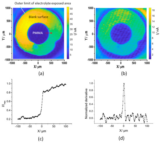 Figure 6a,b shows the photocurrent images of a PMMA dot on the InGaN surface with a modulation frequency of 1 kHz using a focused laser beam at a bias of 0.6 V and 0 V (vs. Ag/AgCl), respectively. The polymer dots were clearly observed in the photocurrent images, with decreased photocurrent values compared to a blank surface area owing to the high impedance of the PMMA dot. The image in Figure 6a shows a significant gradient of the photocurrent across the uncoated area exposed to electrolyte. This can be attributed to the sample not being mounted perfectly perpendicular to the incoming laser beam resulting in a change of the focused laser spot size across the sample. Where applications require imaging over a large area, a tilt module for straightening the sample would have to be integrated into the experimental setup. However, for imaging over small distances, this effect becomes negligible, as will become clear in the next section. The images in Figure 6b and, less obviously, in Figure 6a display a periodic pattern in the photocurrent distribution. It is assumed that this is caused by a striation effect in the InGaN/GaN substrate similar to the one previously observed in silicon [42]. It is worth noting that the ability to image at 0 V will broaden the application of this technique in biological systems, and also possesses an advantage from an energy perspective. To measure the lateral resolution, a photocurrent line scan across the edge of the polymer film was recorded with a focused laser beam and 1 μm step size (Figure 6c). The lateral resolution is derived from the full width at half maximum (FWHM) value of the first derivative of the line [43] (Figure 6d), which is 7 μm for InGaN. This result could be due to a weak adhesion between PMMA and the InGaN surface, thus not giving a steep edge of the polymer, or light scattering within the structure. The diffusion length of minority charge carriers in InGaN should not affect the resolution, as it is less than 200 nm and decreases with increasing indium content [44]. Hence, InGaN is promising for the production of photocurrent images with a higher resolution.