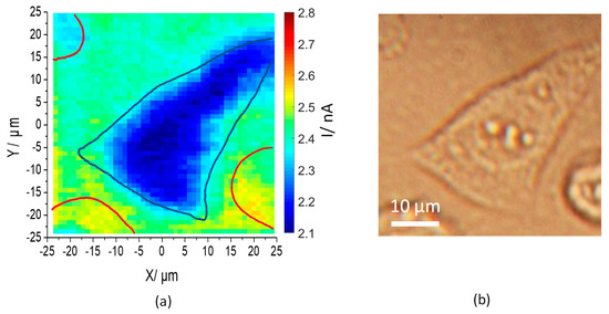 Figure 7a shows a photocurrent image of an MG-63 cell seeded on the InGaN surface obtained at a bias of 1.05 V, with a light modulation frequency of 1 kHz. The cell profile is clearly observed, as the photocurrent is smaller in the cell attachment area than on the blank surface. Both the photocurrent image and the corresponding optical image (Figure 7b) show good correlation. Apart from the cell in the center of the image (outline superimposed in blue in Figure 7a), another three cells are visible towards the edges (outlines superimposed in red in Figure 7a). As the latter cells are rounded, it can be assumed that they are not attached to the sensor surface and do therefore not cause a significant change in the local photocurrent. The photocurrent under a cell attached to the semiconductor surface is affected by the narrow gap (> 10 nm) formed between the cell membrane and the surface, as described previously for cells cultured on ITO [24]. The photocurrent is caused by the oxidation of hydroxide. Transport of hydroxide to the surface is hindered by diffusion into the narrow electrolyte gap between cell and surface, thereby reducing the photocurrent under the cell. The negative surface charge of the cell causes an additional reduction in the transport of hydroxide ions to the surface. Hence, a correlation between the photocurrent and the cell surface charge was found [24].