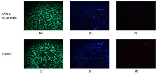 (a,b,c) Fluorescence microscope images of MG-63 cells taken after photocurrent imaging, living cells with intact membranes appeared green, dead cells with collapsed membrane appeared red, and the nuclei of the cells appeared blue. (d,e,f) Images of MG-63 cells that were not subjected to imaging.