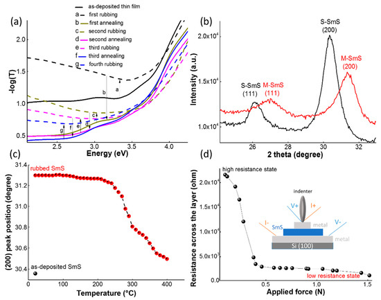 E-beam evaporation starting from a SmS target can be used to deposit SmS thin films. However, the direct synthesis of SmS in powder form is not straightforward, as under sulfurizing conditions Sm2S3 is easily formed. Consequently, other research groups have employed co-deposition of Sm2S3 and Sm metal to arrive at the desired stoichiometry [28]. In this work [13], Sm metal was deposited in a reactive H2S atmosphere, in order to obtain the formation of SmS at the substrate. Both fluxes (Sm, S) need to be carefully balanced. When the sulfur flux is too low, Sm metal can be deposited, while a too high flux leads to the formation of sulfur rich compounds, like Sm3S4 or Sm2S3. Figure 1 shows the essential features of the switching ability (Figure 1a) of a SmS thin film deposited at 250 °C, with H2S pressure of 1 × 10−5 mbar and a 0.8 nm/s deposition rate of the Sm metal. The thin film is polycrystalline (Figure 1b,c) and the diffraction peaks confirm that the as-deposited thin film is in the semiconducting state (S-SmS), corresponding to a high resistive state at ambient pressure (Figure 1d). The lattice constant, as calculated from XRD, is 587 pm. This is smaller than reported values for bulk SmS crystals (597 pm, [29]), but comparable to other reports on thin films [22]. When applying pressure, the resistance across the thin film strongly drops when the applied force exceeds 0.2 N, and a low resistive state is obtained (measured on a thin film stack with bottom and top electrodes, where the SmS thin film was deposited under similar conditions as for the single SmS thin films). Upon release of the pressure, the low resistive state is maintained and the thin film has a metallic appearance (M-SmS). The X-ray diffraction pattern (Figure 1b) confirms this, as the (111) and (200) diffraction peaks are shifted to higher diffraction angles, compatible with the expected reduction in unit cell parameters. The calculated lattice constant in this state is 576 ( pm, which is larger than in the case of metallic bulk crystals (562 pm), indicating that the metallic state contains a mixture of Sm2+ and Sm3+ ions [30]. Literature values for thin films are typically around 570 pm ([13] and refs. therein). The fact that the M-SmS state can be stabilized without pressure is a different behavior in SmS thin films compared to bulk crystals, as the latter switch back to the semiconducting state upon pressure release [31]. In thin films, the substrate apparently plays an important role as it can provide additional stress affecting the needed pressure for the (back)switching, similar to the effect of clamping in the case of piezo-electric thin films [4,28]. Nevertheless, thermal annealing can be used to convert a M-SmS thin film back into S-SmS [13]. Figure 1c shows the evolution of the position of the (200) diffraction peak as a function of annealing temperature (measured in the HTXRD setup, using an oxygen atmosphere). Up to 200 °C, the M-SmS state is stable. While the diffraction peaks start to shift at about 250 °C, only at 400 °C a full switch back to the diffraction angles for S-SmS is obtained. In Figure 1c, the black dot stands for the (200) peak position of the as-deposited S-SmS, prior to the induced transition to the metallic state. This procedure—application of pressure and thermal switch back—can be repeated multiple times, as is shown in the optical behavior of the thin films. Figure 1a shows the absorbance measurements for a 100 nm SmS thin film deposited on glass, initially in the semiconducting state. After application of pressure, by rubbing the surface, the M-SmS state is obtained, which leads to a stronger reflection in the visible part of the spectrum, lowering the transmission through the film [17]. The sample was switched back to the semiconducting state by thermal annealing in vacuum. We repeated this experiment several times, confirming the repeatable switching character of SmS thin films. Previous investigations have shown that a suitable temperature for switching thin films under vacuum annealing is at about 400 °C [32]. We used one hour at 400 °C under vacuum for switching back. At shorter annealing times (40 min) an incomplete switching back was observed, while at longer annealing times (or higher temperatures) degradation could be seen. This degradation could be related to the oxidation of a small part of the thin film surface, even under vacuum conditions. The chemical stability of the thin films under different thermal annealing conditions will be discussed in detail in Section 3.4.