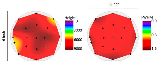 In order to evaluate the structural properties, XRD measurements were performed on 18 different spots evenly spread across the surface of the wafer (Figure 5). The spot size of the X-ray source was 2 mm in diameter. The selected measured spots are a good approximation for the homogeneity across the wafer area. The entire wafer surface was covered by as-deposited S-SmS. The intensity and FWHM of the (200) diffraction peak can be taken as a figure of merit for the deposition homogeneity, as the ratio between the intensities for the (111) and (200) diffraction peaks was fairly constant over the entire wafer area (not shown), pointing at a similar texturing. The intensity values were obtained by subtracting the background of each XRD measurement. Similar FWHM values are obtained over the entire surface, while the diffraction intensity reveals some areas near the edges showing slightly lower values (Figure 5). The different behavior at the edges of the wafer can be explained by the spatial distribution of the Sm and H2S fluxes, with the latter one probably the least controlled in the present setup. Further optimization of the H2S gas inlet method would presumably further homogenize the composition of the thin film. Nevertheless, this is the first time to the best of our knowledge that a switchable SmS thin film is deposited on such a large scale. Recently, co-sputtering was reported to be able to handle the deposition of another piezoresistive Sm-chalcogenide, SmSe, on substrates with a diameter of 200 mm [34].