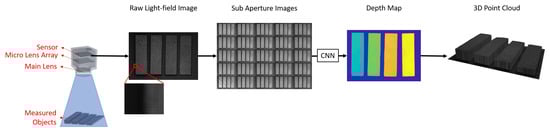 The concept of light-field has a pretty long history. Adelson and Bergen [] parameterized light rays with the plenoptic function , where stands for its 3D coordinate in space and stands for its angle of propagation. By assuming constant irradiance of a light ray along its path of propagation, later researchers [,] reduced this to a 4D function which can be denoted as where and are the coordinates of points where the light ray intersects with two parallel planes. Based on these advances, Ng et al. [] proposed a micro-lens array (MLA) based light-field camera where a high-resolution MLA was installed between the main lens and the camera sensor to record the plenoptic function of incoming light rays. Taking advantage of such light-field cameras, researchers have proven the feasibility of applying single light-field camera for 3D object reconstruction tasks in volumetric flow measurement and 3D geometry reconstruction [,,,].