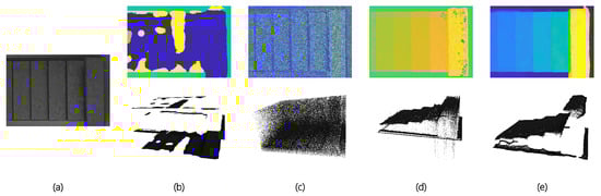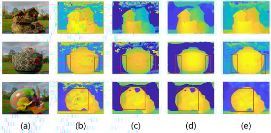 Standard gauge block results. The upper row is depth map and the lower is 3D point cloud. (a) thumbnail; (b) []; (c) []; (d) []; (e) Ours(VommaNet).