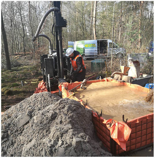 The study was conducted in a drinking water extraction field in Hengelo, Gelderland, The Netherlands. Here, groundwater is extracted from an unconfined aquifer from depths of 15–34 m. Soil borehole logs show mostly sand, gravel and, occasionally, loam layers. The well field contains 12 extraction wells with a maximum flowrate of 130 m3 h−1 for each well. The extraction wells are divided into three clusters with four wells in each cluster (see Figure 1a). During regular operation three pumps extract simultaneously.