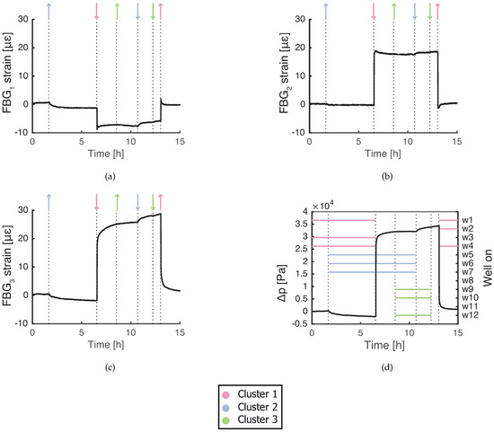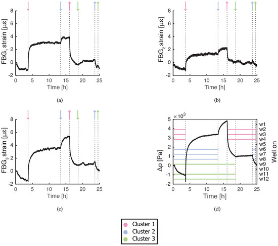 Measured strain response of FBG sensors during regular well operation with off: (a) at depth of 17.7 m; (b) at depth of 18.4 m; and (c) at depth of 19.1 m. (d) Pore pressure change in the reference piezometer in the 17.8–19.8 m depth range. ↑, a cluster of a corresponding color starts extracting; ↓, a cluster of a corresponding color stops extracting.