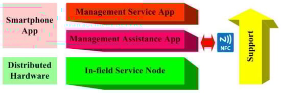 Near field communication technology (NFC) has been frequently used for diverse applications, such as intelligent transportation, industrial automation, smart homes, and other fields. The popularity of NFC is due to advantages such as its low cost, convenience, reliability, and ability to integrate with smartphones [45,46,47,48,49]. Based on NFC, it is possible to build management services with different sizes system for many fields [50,51,52,53]. Among these management service systems, NFC tags serve as the core information storage unit [54,55,56,57,58,59]. However, in such management information system based on NFC tags and smartphones, the apps have a high degree of relevance to the application scenario. Because the demand for Chinese family farms varies widely, if the app is developed in the wrong way, the development cycle and cost are unacceptable. In addition, if an agricultural management service system based on NFC tags and smartphones is to be established, it is necessary to have an appropriate hardware design to construct an effective information channel for specific agricultural equipment management. However, there are many kinds of equipment in agricultural processes in Chinese family farms, so the hardware design faces great challenges too.