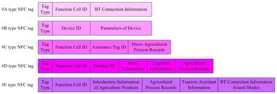 As discussed above, NFC tags play a vital role in the distributed agricultural management systems that are applied to family farms. The content of the NFC label used in this system needs to be unified, and it is oriented to the whole process of production management of family farms. The information such as farming process and agricultural value-added services is difficult to use EPCglobal related standards because it involves more independent production processes and related objects of farmers’ description. The EPCglobal-related standards also lack Mandarin/Chinese support for intuitive reading and writing of NFC tags. In addition, due to the requirements of family farms and service providers for independent intellectual property rights, the system also tends to adopt independent standards in its implementation. Therefore, their function needs to be carefully designed to provide effective support for family farm information management. The system presented in this paper uses five types of NFC tags with different functions: