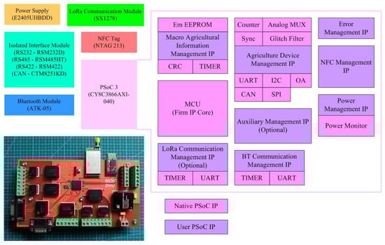 PSoC enables a highly integrated digital–analog hybrid embedded system to realize flexible and customized functions on a silicon chip [62]. With its highly integrated CPU, storage, digital subsystem, analog subsystem, digital/analog bus, Universal Digital Block (UDB) and other system resources, it can adapt to the needs of family farm IoT information management with function differences. The biggest advantage of PSoC is that its high functional flexibility can bring application scalability to meet the diversified application needs of family farms. By combining native IP cores and UDB modules in the design, users can quickly build IP cores and development APIs for specific applications with independent intellectual property rights. Using this method, traditional businesses based on hardware platforms can be transformed into businesses based on IP core services. To meet the different requirements of agricultural devices on interfaces and functions, developers can specially combine PSoC’s internal system resources, supplemented with UDB design and IP cores of their own. This can help achieve the design with high functional flexibility and scalability on the unified hardware platform. Therefore, the needs of different family farms under a unified node hardware structure can be easily met. IP core reuse is oriented to different occasions. Developers only need to use IP core functions with the API interface depending on the IoT management service specification and do not need to conduct complicated work with regard to specific development for devices. In other words, the hardware function implementation process is simplified as a series of IP cores and APIs using. This method can also optimize the system through the addition and deletion of IP cores. In our proposed design, each IP core function structure related to a device corresponds to an NFC tag. According to the information in an NFC tag, in-field service nodes can connect with devices and imply daily management by the IP cores automatically. A PSoC has high scalability and supports the IP core-based management/service mode, the in-field service nodes designed based on PSoCs have the advantages of high adaptability, universality and reliability, short development cycle, low cost, and having independent intellectual property rights.