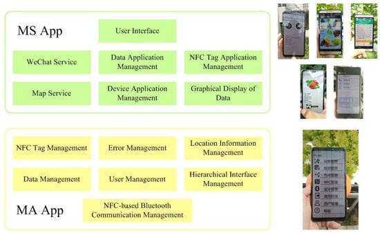 A user interface should be adopted to provide intuitive and effective human–smartphone interaction to users. Graphical display of data can visually display family farm agricultural management service data. NFC tag application management can provide NFC-related services to users (for example, NFC-based agricultural product traceability services). Users can manage the agricultural devices that have been connected to the in-field service nodes through MS Apps. They can also realize management and service based on the agricultural data. All the above functions are based on MA Apps and in-field service nodes. In addition, MS Apps can provide map service and push service for users based on third-party map apps (Baidu Maps or Google Maps) and WeChat. It should be noted that users can flexibly choose and combine the above functions according to their needs. The ultimate goal of a good MS App is to meet the actual agricultural management needs. Developers of the MS App should avoid adding unrelated functions to the MS Apps if there are no corresponding management services in the family farm. The functions of MA App and MS App are shown in Figure 6.