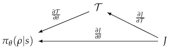 - The derivative of must be bounded. This condition is required to keep the RL score function differentiable and for its derivative to be confined within a stable range. RL algorithms then work as if no transformation of actions are involved in learning. Figure 6 depicts the procedure used to compute the derivative of the score function J of the RL algorithm. is a policy of the RL algorithm equipped with the weight , where s denotes the system state and denotes the abstract action. is a rewritten form of the action transform function, , obtained by currying.