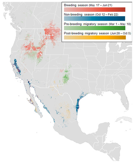 To represent the movement range of long-billed curlews, we use the abundance map [27]. Figure 2 shows the abundance distribution map of long-billed curlews. In the map, the four seasons are represented by different colors, and the distribution density is expressed by the contrast of color. The distribution itself is calculated based on geo records from individuals that have moved more than one kilometer over one hour. For instance, the dark red indicates high-density areas during the breeding season (e.g., Montana, Idaho). During the non-breeding season, San Francisco and California show high density.