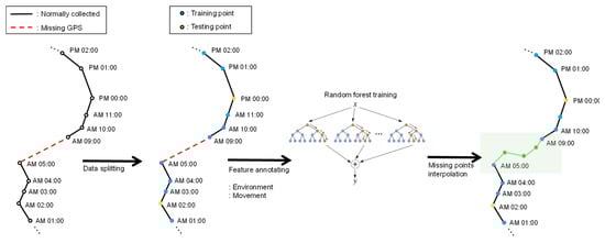 Figure 3 shows an example of movement interpolation process. Two normally observed points are connected by a solid line. If there are any missing points, then they are connected by a red dotted line. For instance, in the figure, we can see that observation records are missing from 6:00 am to 8:00 am. To interpolate these missing records, we first split the geo records into training sets and test sets. Then, we generate a feature tuple for each observation record by augmenting environmental data and movement data as we described in Section 3.1. Each feature tuple is in the form of . For a time sequence of length i, we can make a feature set P of . Basically, we select missing time points at random in the interpolation. Also, we assume that the points of test set are equal to missing time points. Our random forest model interpolates missing bivariate location (latitude and longitude) using a feature tuple of previous missing time points. For example, if a missing location exists a certain time t ( P), we predict the missing bivariate location at time t using the feature tuple at time t-1 as independent variables. The random forest training process follows bagging algorithm, which randomly selects a sample of size k from the feature set P and fits the decision trees. During the tree evolution, each node of the tree chooses the best split size given a randomly selected sample. Each tree is grown to the maximum size until it has no longer split. After tree evolution, prediction for missing coordinate can be calculated by averaging the predictions from all trees. Once the training is over, we are given an optimized random forest model, which can be used for interpolating missing observation points. After training, we perform inbuilt cross-validation and calculate the prediction accuracy using mean absolute percentage error (MAPE) and root mean square error (RMSE) to obtain an optimal random forest. In particular, we used the grid search method to find optimal parameters for the random forest. To construct and train the model, we used scikit-learn [34], a python machine learning package.